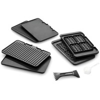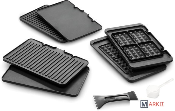 | Комплектация | • 2 плоские пластины• 2 рифленые пластины• 2 пластины для вафель• поддон для сбора жира• лопатка-скребок для чистки |