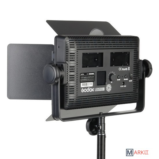 Студийный осветитель Godox LED500C разработан как портативный универсальный источник постоянного света с регулируемой цветовой температурой, работает от аккумуляторной батареи и от сети переменного тока.Мощность 32 ВтLED500C излучает световой поток с освещенностью до 2900 люкс (на 1 м/4100К), при этом максимальная потребляемая мощность составляет всего 32 Вт.Регулируемая цветовая температураОсветитель с индексом C является биколорным, цветовая температура регулируется в пределах 3300К-5600К±300К. Данный осветитель можно настроить на сбалансированное освещение совместно с любым другим источником освещения (от лампы накаливания до солнечного света), также это дает дополнительные творческие возможности в создании различных художественных эффектов.Дистанционное управлениеОсветитель совместим с пультом дистанционного управления RC-A5 (приобретается отдельно), который позволит управлять всеми функциями осветителя на расстоянии более 20 м. Пульт поддерживает функции вкл/выкл осветителя, выбор канала/группы и регулировку яркости.Удобная панель управленияНа панели управления находится контрастный ЖК-дисплей, регулятор яркости/цветовой температуры, кнопка выбора канала/группы и кнопка stop/run (для отключения осветителя с последующей возможностью включения его с пульта). На большом дисплее с яркой подсветкой хорошо видно параметры, а удобный широкий цифровой регулятор позволяет управлять яркостью с шагом 1% в диапазоне 10-100%.Функция памятиИспользуемые настройки сохраняются в памяти осветителя автоматически, при следующем включении можно быстро вернуться к работе.4-лепестковые шторки в комплектеЧетырехлепестковые шторки помогут получить световой акцент на объекте съемке или избежать нежелательной засветки объектива камеры.Питание от сети или от аккумулятораНа задней панели осветителя расположены 2 отсека для установки аккумуляторных батарей серии NP-F (батареи приобретаются отдельно). Индикатор заряда батареи отображается на ЖК дисплее осветителя. В условиях студийной съемки осветитель можно подключить к сети 220В с помощью входящего в комплект сетевого адаптера.