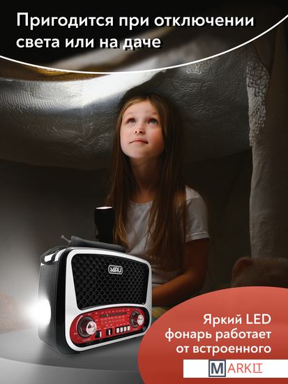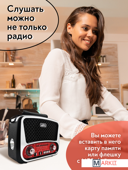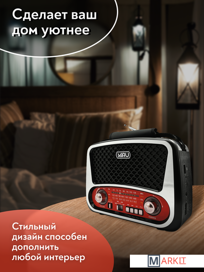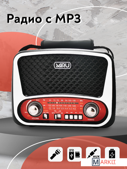 Радиоприемник MIRU SR-1019 имеет ретро дизайн и выполнен в черно-серебристом корпусе с красными вставками и представляет собой простое устройство для воспроизведения потокового радио вещания. Модель предусматривает всего один динамик, но этого вполне достаточно, чтобы вы получили насыщенный звук. Радиоприемник улавливает радио каналы в диапазоне FM, АМ и SW, гарантируя отличную связь благодаря встроенной телескопической антенне, которая способствует улучшению сигнала. MIRU SR-1019 имеет линейный аудио вход и поддержку чтения microSD карт, а наличие фонарика на боковой панели, будет отличным дополнением. Благодаря тому что, радиоприёмник работает не только от сети 220 В, но и от аккумулятора или батареек, он является мобильным устройством. Вы сможете взять его на пикник и наслаждаться трансляцией любимой радио передачи в компании с веселыми ведущими. Для управления устройства предусмотрены механические переключатели.